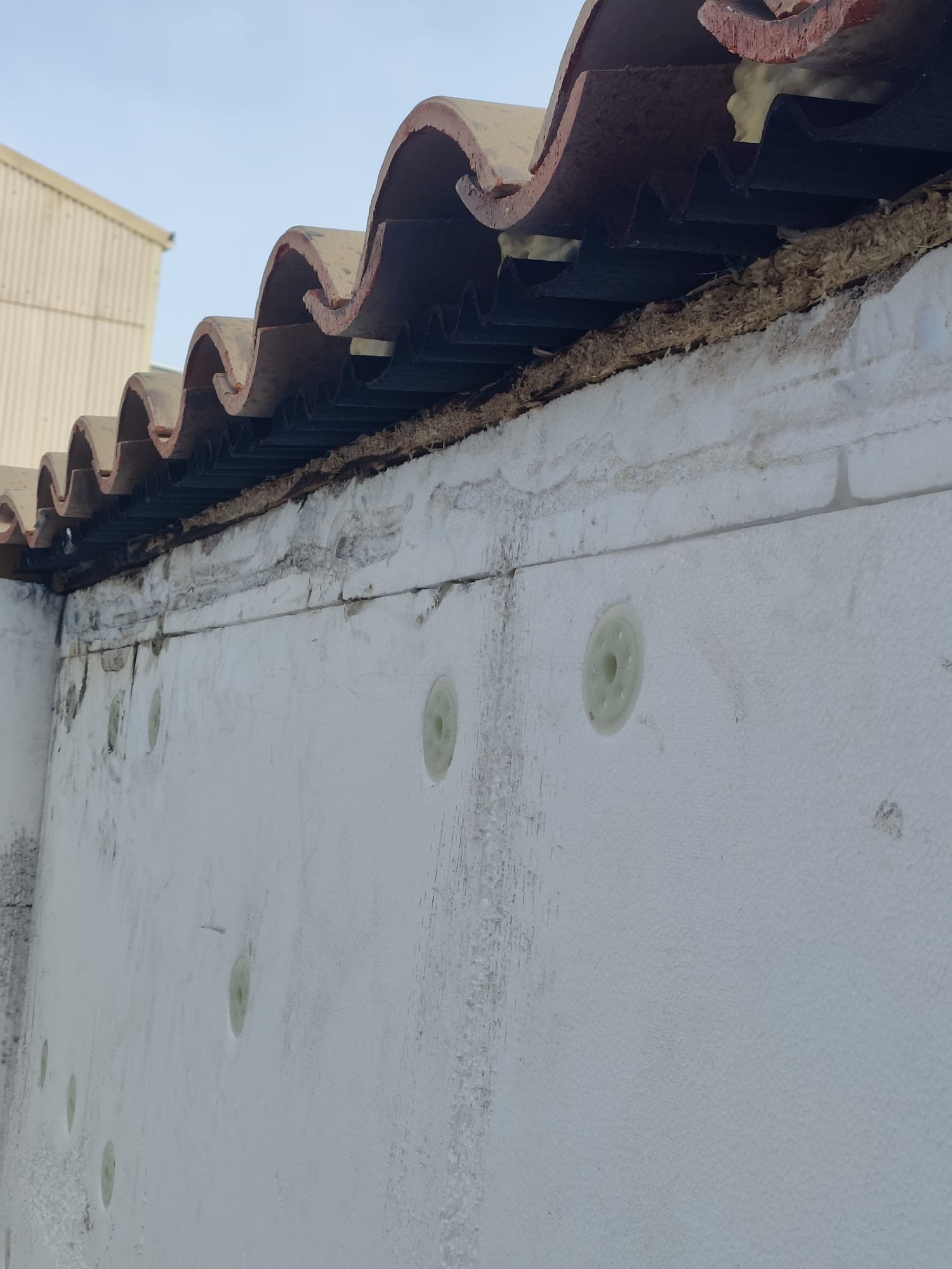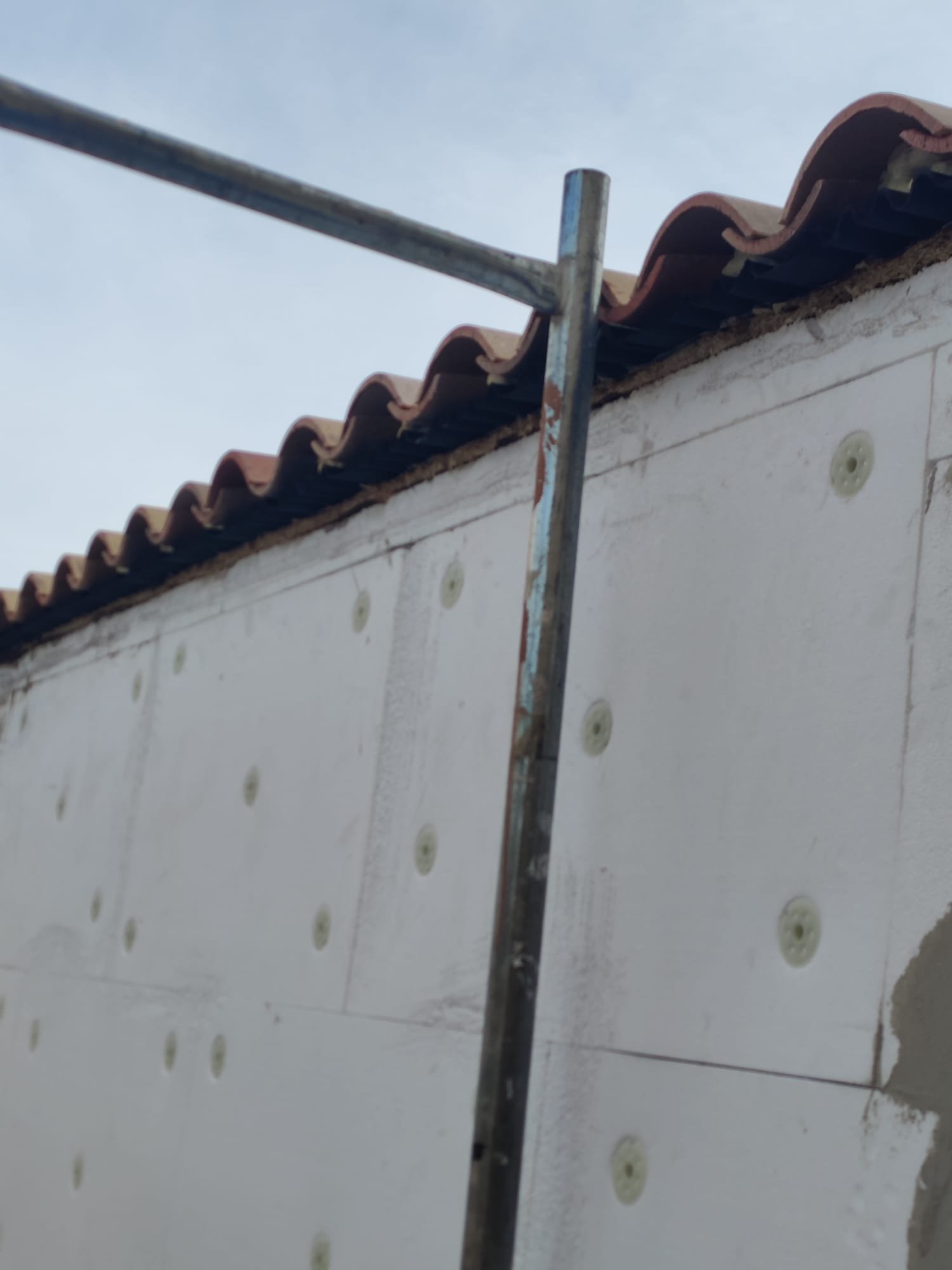 ETICS con paneles EPS. Adhesivo + fijación mecánica, malla de refuerzo y mortero acrílico de acabado.